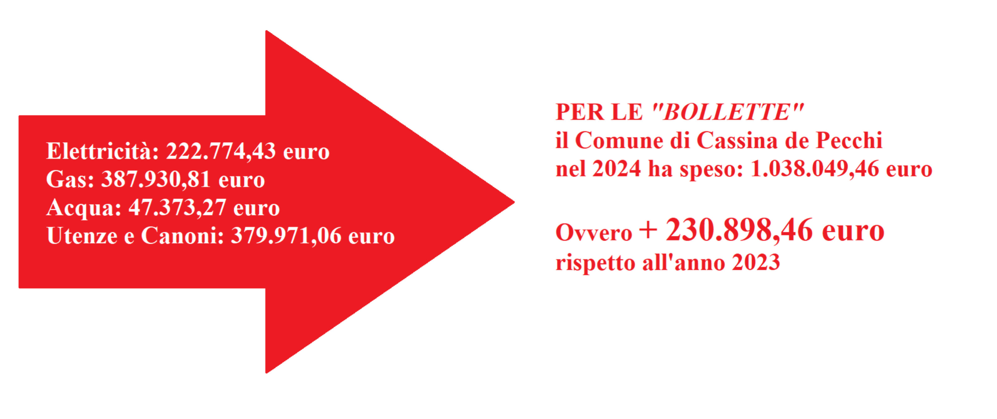 Per le "bollette" il Comune di Cassina de Pecchi ha speso nel 2024 1.038.049,57 Euro perché le strutture Pubbliche, Scuole e Palestre su tutte, sono strutture vecchie ed energivore, non investire in diversificazione energetica, significa continuare a dedicare ingenti somme, in aumento tra l'altro rispetto al 2023 (allora il Rendiconto certificava 807.151,11 euro) per mantenere ciò che invece necessita rigenerazione.